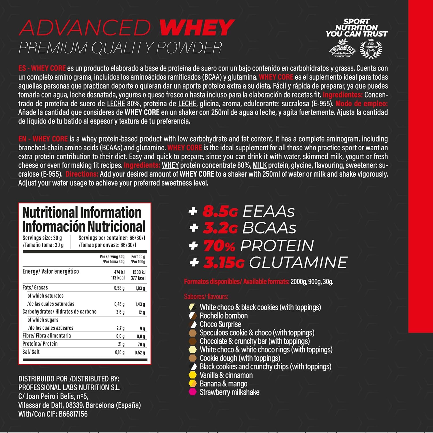 A proteína de soro de leite é uma fonte de alta qualidade com um excelente perfil de aminoácidos essenciais, essenciais para a síntese e recuperação muscular. Whey Core combina proteínas de rápida absorção com baixo teor de gordura e açúcar, garantindo uma ingestão nutricional equilibrada para qualquer atleta ou pessoa ativa.