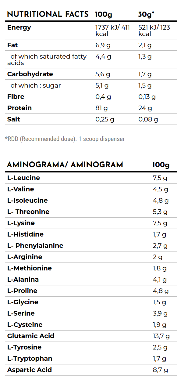 Concentrado de proteína de suero de leche 96% [emulgente: lecitinas (soja)], aromas, espesante: carboximetilcelulosa, edulcorante: sucralosa, DigeZyme® [complejo multienzimático (maltodextrina, alfa amilasa, proteasa neutra, celulasa, lipasa, lactasa)]. / Whey protein concentrate (milk) 96% [emulsifier: