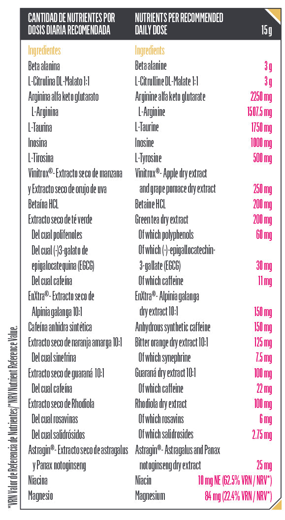 Pré-treino de última geração especialmente formulado com aminoácidos, ácidos orgânicos e cafeína, concebido para melhorar significativamente a concentração, a potência e o desempenho antes e durante o treino.
